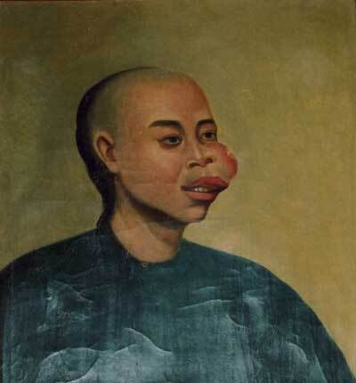 The extreme swelling of the left sinus and the relative absence of background shading, give Lam Qua's rendering of Ashun's face a quasi-cubist two-dimensionality around the cheek. He has choosen to paint the patient in a 3/4 pose with the eyes looking off to the viewer's right, but the growth has pushed the nose, mouth, and cheek in such a way that they address the viewer frontally. Parker's case notes indicate that the patient did not return though he expected the swelling to recur and the doctor takes this as a sign of success. But the account leaves room for another possibility. The carpenter, who had operated on himself before, may have familiarized himself with the tools and techniques employed by "the foreigner" and taken measures once again into his own hands.